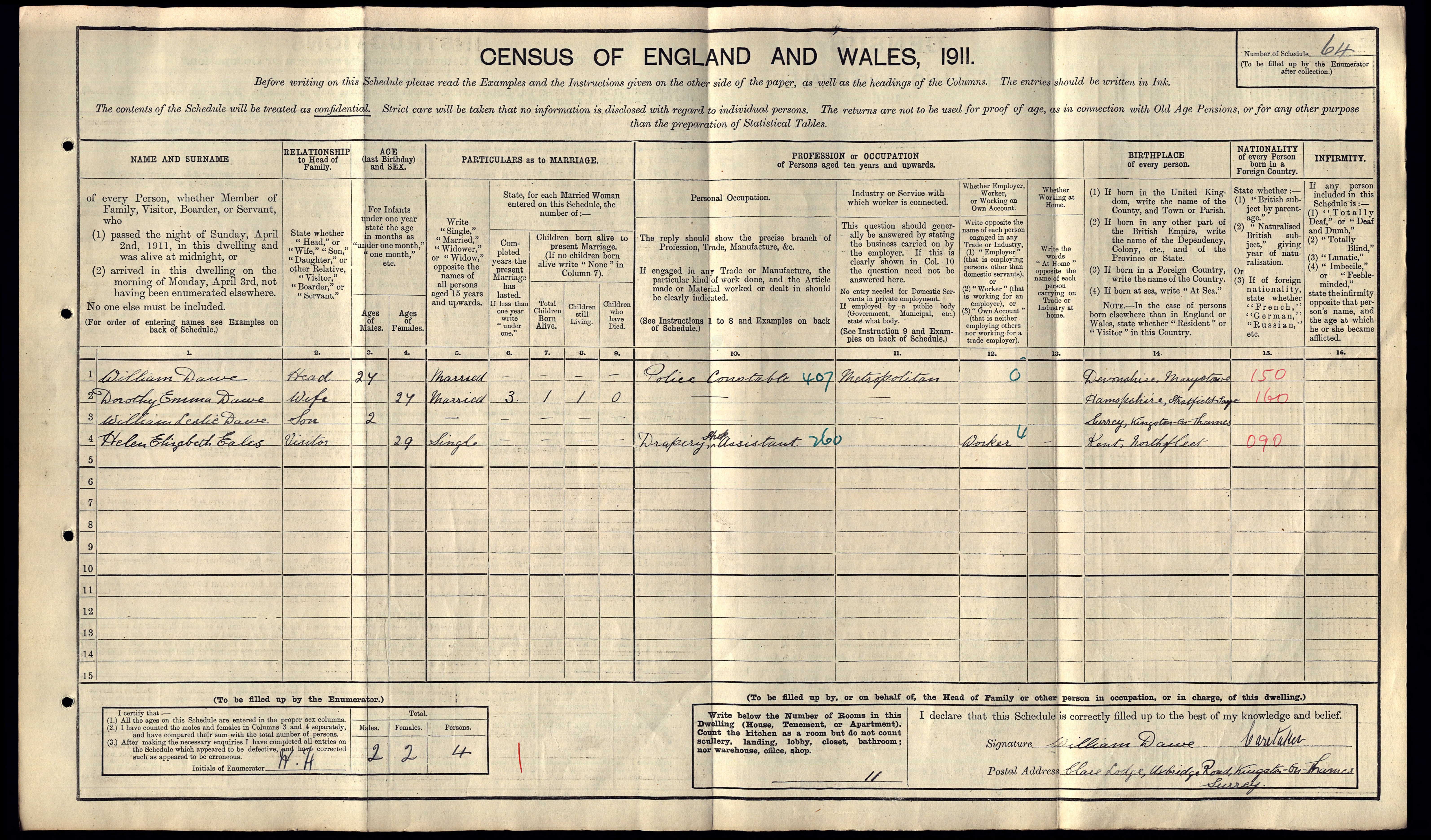 | 1911 Census | WLD/ William Dawe & Dorothy Emma/Helen Elizabeth Eales | Census |